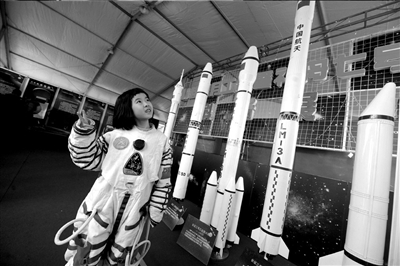 當(dāng)天下午,設(shè)在騰龍閣的航天科技體驗(yàn)場不斷有三五成群的游人進(jìn)出,神七返回艙的全尺寸模型、嫦娥一號(hào)的實(shí)物火箭殘骸、剛剛研制出來的長征五號(hào)運(yùn)載火箭的微縮模型……站在只有在電視上能見得到的航空物品前,小朋友拉著爸爸媽媽問個(gè)不停。旁邊,等待試穿宇航服的游客自發(fā)排起隊(duì),準(zhǔn)備過把“航天癮”!吧駳獍,快給我拍一張。”湖南來京務(wù)工人員張淼第一次逛廟會(huì),穿好宇航服后,他立即站到太空照片的背景前拍照留念。
