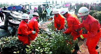 10多分鐘后,接警的消防戰(zhàn)士、解放軍163醫(yī)院的醫(yī)務(wù)人員、望城縣交警大隊(duì)的交警趕到了事故現(xiàn)場(chǎng)。消防戰(zhàn)士迅速用工具切割車體,將車內(nèi)傷員救出,醫(yī)務(wù)人員將傷員迅速送往醫(yī)院。由于節(jié)后返程的車輛大增,交通一度堵塞。交警迅速疏導(dǎo)交通,3名當(dāng)?shù)氐闹伟碴?duì)員也馬上投入到搶救傷員之中,一臺(tái)從岳陽(yáng)返回廣東的吉普車路過,見此情景,一名警察也跳下車來幫助疏導(dǎo)交通,當(dāng)?shù)夭簧俅迕衽浜辖痪谑鹿尸F(xiàn)場(chǎng)設(shè)置警戒線……車禍現(xiàn)場(chǎng)雖然慘烈,但軍警民生死大營(yíng)救有條不紊地進(jìn)行。