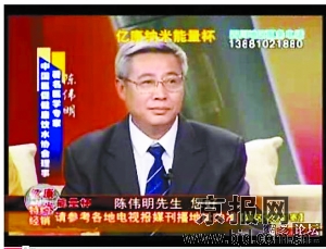 在一家電視臺播出的億康納米能量杯廣告中,一位學(xué)者打扮的人端坐當(dāng)中,文字顯示,“專家”名叫陳偉明,是中國醫(yī)促健康飲水協(xié)會理事。而在另一幅華佗延壽酒的廣告視頻截圖中,容貌一樣,甚至連領(lǐng)帶圖案都一樣的“陳偉明”,“搖身一變”卻成了“關(guān)新良”,身份也變成《北京中醫(yī)》雜志編委、中國中西醫(yī)結(jié)合協(xié)會理事、北京中日友好醫(yī)院主任醫(yī)師。