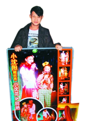 每天晚上8時(shí)11分,小沈龍都會(huì)和同伴們?cè)诮鹌计级宿D(zhuǎn)劇場(chǎng)開演。這幾天因?yàn)檫^年的緣故,小沈龍他們通常會(huì)表演到晚上11時(shí)。因?yàn)樾∩蜿柣鸨木壒剩诮鹌计级宿D(zhuǎn)劇場(chǎng)買票的時(shí)候,工作人員都會(huì)提醒:“我們這里有一個(gè)小沈龍,和小沈陽一樣一樣的!痹谝粡埡(bào)上則印著“小沈陽模仿秀——小沈龍”。