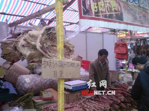 照片顯示:一個(gè)簡(jiǎn)陋的肉類(lèi)食品攤位,攤位前擺放著臘腸、熏臘肉等肉制品,一名中年男子攤主正和一名顧客進(jìn)行買(mǎi)賣(mài)交易,攤位頂上掛著整頭的干豬肉,四周是零亂地堆滿(mǎn)了一些紙制品包裝箱、紅色塑料盆,攤位掛著“好吃不貴”條幅,最為顯眼是支撐攤位的一根本柱上用一塊硬紙板上用毛筆寫(xiě)著警示牌。