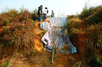 位于望城縣星城鎮(zhèn)銀星村的風篷嶺二號墓,距離公路不遠。記者翻過一道矮墻,很快便爬上墓葬所在的一座小山坡。盜洞位于山腰,現(xiàn)已被薄膜覆蓋,薄膜上還壓了些樹枝、竹條等物。記者掀開薄膜一角,依稀可看到漆墨的盜洞。這時,一名保安過來阻止記者拍照。該保安向記者證實,這里前不久確實發(fā)生過文物被盜案件。