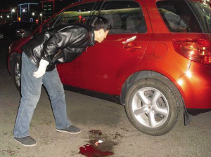 在一知情者的帶領(lǐng)下,記者找到了死者事發(fā)時(shí)乘坐的轎車。這是一輛紅色長(zhǎng)安鈴木轎車,車的左側(cè)后座門把手上方,一個(gè)長(zhǎng)約10厘米的大口子清晰可見(jiàn),大口子已透過(guò)轎車鋼板,足見(jiàn)當(dāng)時(shí)進(jìn)入車內(nèi)煙花的威力之大。轎車后座的靠背上,還留有一大攤血跡。
