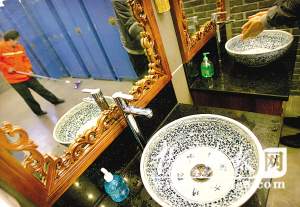 廁所里面布局大體和普通廁所一致,不同的是,洗手池是高檔的青花瓷,而且還多出了專供殘疾人士和母嬰專用的兩個隔間。隔間的門是紅色木雕門(男廁為藍(lán)色),且是明清風(fēng)格的兩扇拉門,其上雕刻細(xì)致,圖案精美,連拉環(huán)的做工都很逼真,記者感覺,進去如廁就好像進了一個古時候的廂房。