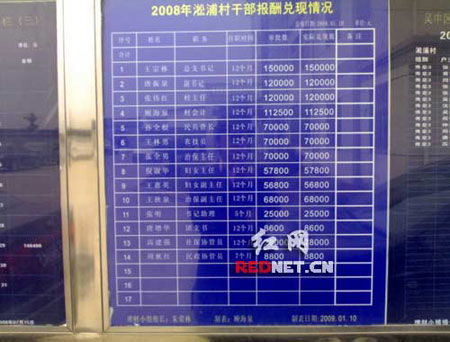 “一個村官年薪15萬,嚇得俺一跳!”16日中午,網(wǎng)友“湘水悠悠”在紅網(wǎng)論壇發(fā)帖,稱在搜狐新聞社區(qū)、天涯社區(qū)等網(wǎng)絡社區(qū)看網(wǎng)友貼出的蘇州市吳中區(qū)甪直鎮(zhèn)淞浦村村務公開的一張照片,內容為2008年該村“村干部報酬兌現(xiàn)情況”,村支書年薪15萬,村主任12萬,月薪過萬。有網(wǎng)友感慨說,“這收入可比公務員強多了”。