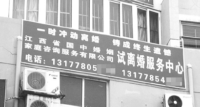 “一時(shí)沖動(dòng)離婚,鑄成終生遺憾!苯,江西省南昌市北京東路京城大廈外墻懸掛的一塊大型廣告牌,吸引了過(guò)往市民的注意。做廣告的不是婚姻調(diào)解機(jī)構(gòu),而是一家“試離婚”服務(wù)中心。