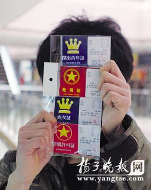 昨天,記者在常州南大街商業(yè)步行街的一家商鋪里看到,一些彩色的塑料卡片竟然印上了“嫖娼許可證”、“處男證”等刺眼字樣。記者看到,在一張“嫖娼許可證”的左半部分紅底黃字,不僅寫有“嫖娼許可證”的字樣,還煞有介事地印上了“網(wǎng)絡(luò)奸淫委員會(huì)”字樣;右側(cè)為白底黑字,姓名、年齡、性別等一應(yīng)俱全。采訪中不少市民表示,這樣的惡搞卡片實(shí)在有些低級(jí)趣味,很容易對(duì)小學(xué)生以及青年人產(chǎn)生不好的影響。