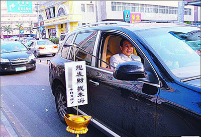 組圖中,一輛黑色保時捷正在行駛,前排一白衣中年男子將一雷人“釣具”伸出車窗外,邊行邊“釣”!搬灨汀笔且粋高爾夫球桿,“魚餌”是個“金元寶”,“垂釣”口號則是“想發(fā)財找朱!保峙詷(biāo)有一個手機(jī)號碼。據(jù)圖說介紹,該場景出現(xiàn)在2月20日的深圳市羅湖區(qū)寶安北路深圳市人才市場附近。