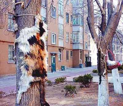 近日,在天涯、華商網(wǎng)等各大論壇都可看到這樣一個(gè)帖子——《慘無人道,殺死流浪貓吃肉后還剝皮綁在樹上》。點(diǎn)擊進(jìn)去可以看到,在某小區(qū)一戶人家門前的樹上,兩張貓皮一左一右被綁在那里,繩子分別從嘴部和尾部勒過。