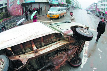 接讀者報料后,記者第一時間趕到沙市鎮(zhèn)事發(fā)現(xiàn)場。在書院路與建文路的交叉口斑馬線上,側(cè)翻著一輛小貨車。盡管一直下著毛毛細雨,但小貨車駕駛室窗口邊一米長的血跡還明晰可見。當?shù)鼐用裰阜Q肇事車是瀏陽市交通局沙市交管站的執(zhí)法車,停在10多米遠的地方,牌號是湘A8F905,執(zhí)法車左側(cè)中間有被撞的印跡,車頭對著倒地的小貨車。