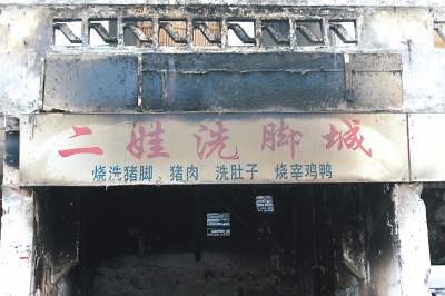 昨日,記者在九坑子農(nóng)貿(mào)市場中找到了這家“最牛洗腳城”,由于該地段即將拆遷,該店鋪內(nèi)早已空無一人,但“二娃洗腳城”的招牌依然高掛在這家僅10平米大小的店門前,在這片凌亂的地方,顯得十分醒目。