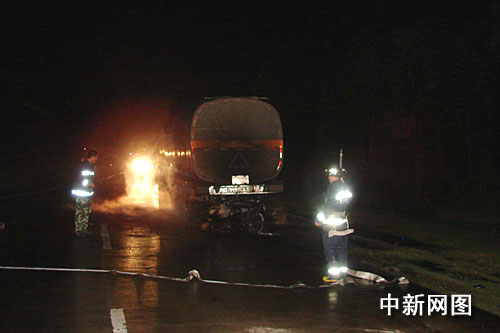 欽州消防隊(duì)10名官兵聞警迅速出動(dòng)。事發(fā)現(xiàn)場(chǎng),一輛車牌號(hào)為粵G的油罐車后輪胎已全部著火,一輛摩托車在大火中熊熊燃燒,油罐車車主已不見蹤影。
