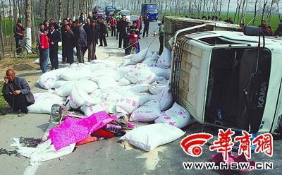 記者在現(xiàn)場看到,一輛車號為陜A17243的小貨車側翻在馬路北邊,車窗玻璃全部破碎,車上拉的麩皮撒落二三十米。靠近馬路邊的一塊破布下,身穿紅色褲子的王維維壓在自行車下。