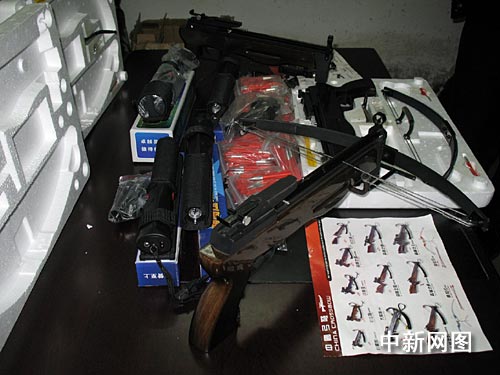 摸清情況后,派出所民警于當(dāng)日下午突然出現(xiàn)在該服裝檔口,從店內(nèi)搜出小飛狼牌弓弩3把(弩是一種利用彈簧裝置發(fā)射箭頭和鋼球的器具,有較強大的殺傷力,查獲的小飛狼牌弓弩的最大射程能達到60米,精確射程為40米 )、超高壓交流脈沖電警棍3支、超高壓防爆自衛(wèi)器共1支、獵箭550支和鋼珠彈89顆。這些器具都具有非常大的殺傷力和社會危害性,一旦落入犯罪分子手中,后果將會不堪設(shè)想。