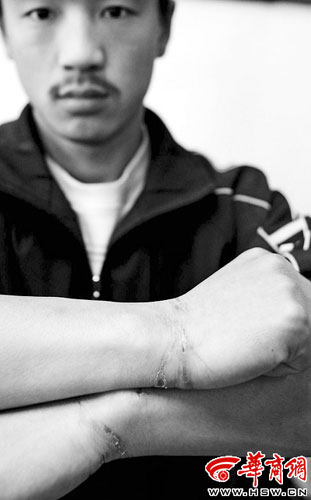 吳明的兩個手腕上有明顯的傷痕。他曾經(jīng)去醫(yī)院檢查過,診斷為肌肉拉傷。他開了些療傷的藥,花費110元。