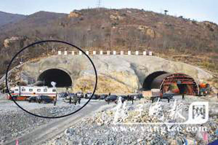 昨天下午4點左右,記者趕到現(xiàn)場?吹讲粫r地有車輛進(jìn)出隧道口,數(shù)十名戴安全帽的工作人員焦急不安地來回穿梭。工地外邊的一條水泥路上,幾名施工人員拎著幾個紅色的塑料袋,記者發(fā)現(xiàn)里面裝著鞭炮和紙錢,據(jù)其中一名工人介紹,他是貴州人,這是燒給兩名遇難老鄉(xiāng)的。