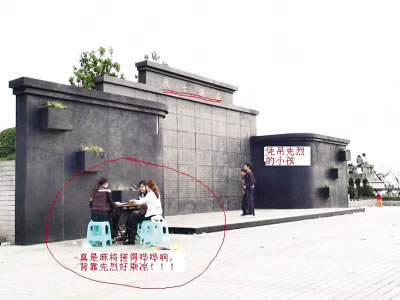 天涯網(wǎng)友“surperdry1”稱,15日那天,春光明媚,他帶上全家人到位于江津艾坪山的烈士陵園里面緬懷先烈。進入陵園卻發(fā)現(xiàn)麻將聲聲,雞鳴不已,并配發(fā)大量照片以證實自己的話。此帖一出,立即引來網(wǎng)上熱議。烈士陵園怎能受到如此待遇?“surperdry1”還說,盡管草坪上有石碑警示路人“請您尊重安息在陵園內(nèi)的革命英烈,用文明的言行維護陵園的莊嚴肅穆”,但游人仍然我行我素。