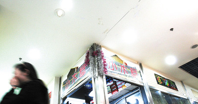 昨日中午,記者在現(xiàn)場發(fā)現(xiàn),其主要通道和許多門市的墻面上開始清晰地出現(xiàn)大小不一的裂縫。“感覺像每天都在經(jīng)歷地震!贝笃航鹣笫兰业叵律虉鯟區(qū)105號商戶趙庭明指著頭頂附近的一條裂縫說,前天上午,巨響突然傳來,一位恰巧經(jīng)過的老太以為發(fā)生地震嚇得當即蹲倒在地。