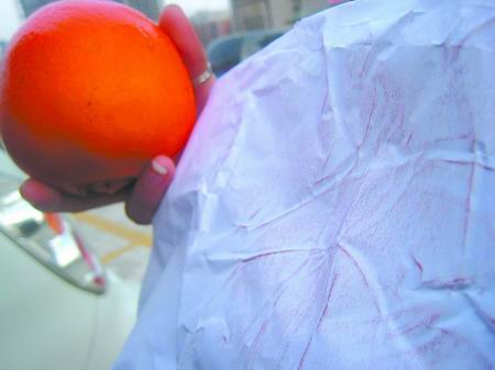 “網(wǎng)友們說(shuō),有些商販為了讓橙子色澤更漂亮、賣(mài)相更好,就把色素注射到橙子皮里,再在皮上打些石蠟,使橙子看起來(lái)很新鮮,但這樣的橙子會(huì)‘掉色’!痹S女士說(shuō),她用紙蘸了些水,在還沒(méi)食用的橙子上擦拭,“紙變成紅的了,我又用手去擠剝下來(lái)的橙子皮,流出來(lái)的水也是紅的。”