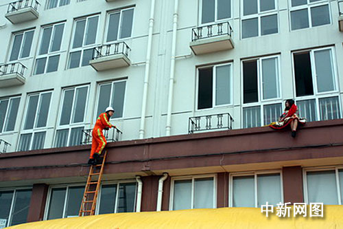接警后的消防官兵迅速到場(chǎng),指揮員立即下令對(duì)事故現(xiàn)場(chǎng)進(jìn)行警戒隔離,維持現(xiàn)場(chǎng)秩序,防止圍觀人員起哄,影響救援工作;同時(shí)在輕生者所站位置下方迅速鋪設(shè)救生氣墊,防止意外情況發(fā)生;同時(shí)由指揮員帶領(lǐng)1名官兵到二層窗外露臺(tái)上進(jìn)行營救。