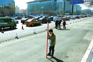 昨日12時許,西單文化廣場前的長安街非機動車道兩頭出入口,已經被拉上警戒線,交警及協(xié)管員指揮過往非機動車,由廣場人行道繞行。警戒線內,非機動車道上一面積近40平方米的路面輕微凹陷,形成一個明顯但弧度不大的低洼處。柏油路面上,工作人員用噴漆標記了沉降范圍,以及需要進行勘測的監(jiān)測點。