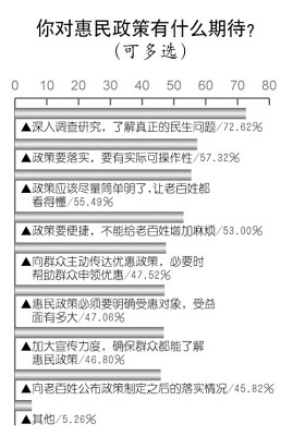 調(diào)查中,47.0%的人表示一些政策“限制太多,惠及面太小”,23.4%的認(rèn)為惠民政策的最大問題是“沒有調(diào)查研究,想當(dāng)然地制定政策”。