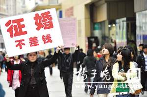 “征婚,不差錢”。昨日下午,在南京新街口正洪街廣場,一名青年女子高舉寫著這五個大字的廣告牌,從逛街的人流中走過,雷人的廣告詞引來眾多市民圍觀。緊跟在后面一名中年男子舉著另一塊廣告海報,密密麻麻的文字揭示了其中的玄機。原來,中年男子是南京一家婚介公司的負(fù)責(zé)人,此舉是為北方某地一千萬富翁征婚。記者通過QQ聯(lián)系采訪了這名富翁,得知這位北方漢子竟對南京女孩情有獨鐘,執(zhí)意要在南京找到另一半。