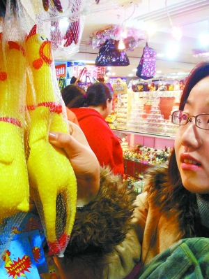 昨天下午,記者在崇文門搜秀玩具飾品區(qū)看到,至少有三四個攤位的老板都把這種慘叫雞玩具掛在了顯眼處。很多年輕人走過攤位時,都會被發(fā)泄雞鮮艷的顏色、奇特的造型所吸引。不由自主地捏上一把,傳來各種各樣的慘叫聲讓人忍俊不禁。
