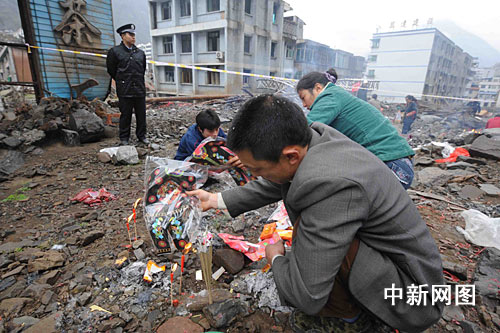 這是大地震后第一個(gè)傳統(tǒng)清明節(jié),老縣城廢墟外的封閉鐵絲網(wǎng)清晨七時(shí)準(zhǔn)默默打開,特意為此地幸存的父老鄉(xiāng)親們開放。綿綿人流回到已成廢墟的千家萬戶和學(xué)校機(jī)關(guān)等地前,焚香燃燭,捧上鮮花。只聽遍地哭聲四起,人人都向遇難親人傾吐衷腸。