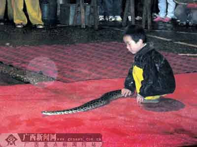 表演團(tuán)體的主持人稱,這條蟒蛇有5公斤多重,“小毛毛”(年紀(jì)較小的表演人員)待會(huì)兒將斗蛇,而且還將騎在蟒蛇身上,就像騎馬一樣。當(dāng)時(shí),小毛毛不斷挑逗著蟒蛇,不時(shí)怕打著蟒蛇的尾巴。該團(tuán)體主持人還說(shuō):“我們還有一條30多公斤的蟒蛇,小毛毛待會(huì)也將騎在它身上。”