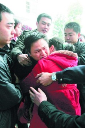 昨日下午4時(shí)05分左右,陰雨綿綿,在長(zhǎng)沙市看守所,當(dāng)犯罪嫌疑人唐斌被警方押出大門,其身懷六甲的妻子撲到他懷里痛苦失聲時(shí),他流下了悔恨的淚水。