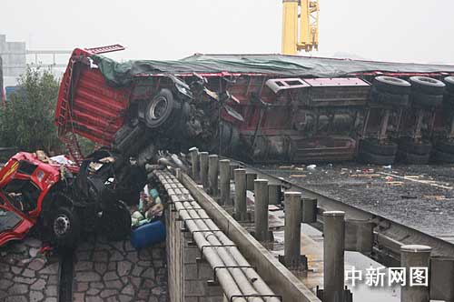 事故的影響,當(dāng)天上午9點(diǎn)多,高速公路上被堵車輛綿延數(shù)公里。大掛車雖已被吊離,但現(xiàn)場(chǎng)地面上仍冒著白煙,附近散落著許多木箱、玻璃碎片和一些裝有危險(xiǎn)品的大桶。安監(jiān)、環(huán)保等部門做了現(xiàn)場(chǎng)勘查,工作人員用石灰中和等多種措施來(lái)減少酸性物質(zhì)對(duì)周邊土壤的腐蝕。