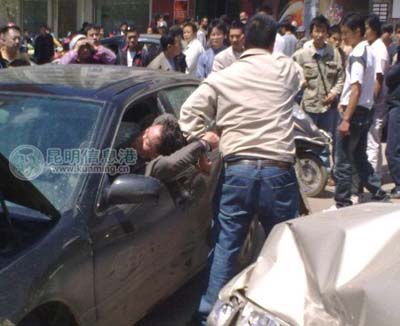 記者在附近找到了不少目擊現(xiàn)場的群眾,大家均表示在車禍發(fā)生后聽到了兩聲巨響!笆掳l(fā)時大概在下午1點45左右,一輛銀灰色夏利車在北辰大道由東向西行駛,到路口時突然有一輛黑色尼桑車以很快的速度迎面沖上去,將銀灰色夏利車撞得轉了個向!睋(jù)事發(fā)當時在路口值勤的交通協(xié)管員陳先生介紹,黑色夏利車逆行撞上夏利車后,后面追上來的藍色大眾商務車也避讓不及撞到了黑色尼桑車上。(作者:黃凱 )(昆明信息港)