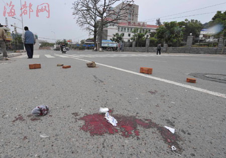 記者趕到現(xiàn)場(chǎng)時(shí),老人剛被送往醫(yī)院,路面上滿是血跡。警方正在用磚頭圍著的事故現(xiàn)場(chǎng)勘查!爱(dāng)時(shí)那名老人從分院走出來(lái),過斑馬線時(shí),一輛摩托車從他后面撞了上去。”一目擊者說,那輛“黑色,很新”的摩托車速度很快,“老人被撞得飛起,在地上滾了幾下,躺在路上呻吟著,頭上、腳上都是血!