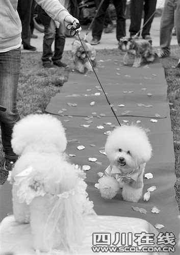 昨天下午3點(diǎn),成都非物質(zhì)文化遺產(chǎn)國(guó)家公園內(nèi)響起了結(jié)婚進(jìn)行曲,正當(dāng)市民們駐足想看下新人的模樣時(shí),兩只白色的比熊犬身穿鮮艷禮服走上紅地毯,突然闖進(jìn)大家的視野。原來(lái),它們就是這場(chǎng)婚禮的主角。13套豪華禮服,紅毯花房,“狗友”證婚還有入洞房等等,一樣都不能少。主人請(qǐng)人專(zhuān)門(mén)為狗狗策劃、舉行這么隆重的婚禮,數(shù)百在場(chǎng)市民對(duì)此褒貶不一……