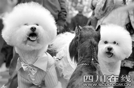 “當(dāng)時在網(wǎng)上比熊俱樂部上面認(rèn)識的!睋(jù)新郎幺幺的主人馮悅悅介紹,一般喜歡養(yǎng)狗的人都會有一個交流群,平時大家有什么經(jīng)驗或者需要配種之類就可以網(wǎng)上聯(lián)系。3月下旬,群里舉辦了活動,要選最美的狗狗配對拍婚紗照!扮坨酆涂煽梢粋髡掌,就同時被選上了!瘪T悅悅說,剛巧新娘可可的主人于瀾瀾也正想給2歲的可可找個伴兒,大家一拍即合,舉行了這場婚禮。