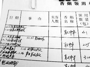 在一份招待用煙流水賬中,從2008年11月至2009年2月期間,招待用煙共用去了5277包,近530條。每個(gè)月的招待用煙數(shù)量都超過了1319包,均為中華香煙,有硬盒有軟包,按均價(jià)每盒50元算,相當(dāng)于每月要花銷6.6萬元。記者發(fā)現(xiàn),其中用煙數(shù)量最多的是今年的1月份,共用去2789包中華牌香煙,約為280條。在這份招待用煙的流水賬最下方,則標(biāo)出了這四個(gè)月當(dāng)中招待用煙數(shù)目出現(xiàn)了超支,多用了1934包。