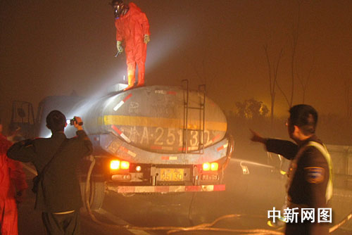 當(dāng)?shù)馗咚俟穲?zhí)法部門立即關(guān)閉該高速路段上道口,避免社會(huì)車輛進(jìn)入危險(xiǎn)區(qū)域。當(dāng)?shù)叵啦块T隨即趕到現(xiàn)場,通過往泄漏處噴水的方式,對泄漏的鹽酸進(jìn)行稀釋。