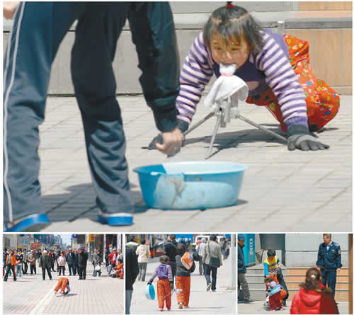 只見五六歲的小女孩熟練地做著高難度的彎腰動作,而一旁稍大些的小男孩則很職業(yè)地觀望著周圍的動靜(后來記者了解到他原來是在觀察是否有管理者到來,因為這里是不讓擺攤賣藝的),同時掃上一兩眼路人施舍的錢幣是多少。