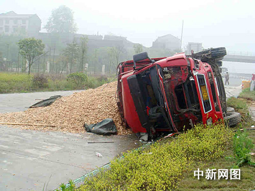 中新網(wǎng)長(zhǎng)沙4月17日電(雷坤平 肖前輝)17日上午,一輛超載的大貨車(chē)在駛?cè)肷?陽(yáng))懷(化)高速公路安江服務(wù)區(qū)時(shí),因駕駛員疲勞駕駛操作失誤,導(dǎo)致大貨車(chē)側(cè)翻在服務(wù)區(qū)入口處。