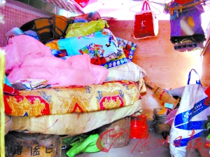 小窩棚里面有一個(gè)破舊的床墊,用木桶、磚塊等胡亂墊高。又臟又潮濕的被子等日常生活用品和阿婆撿回來的一些廢品雜亂地堆放在床上和底下,散發(fā)著一股難聞的氣味。