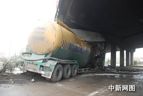 據(jù)現(xiàn)場(chǎng)勘察得知,發(fā)生事故的車輛號(hào)牌為粵R5355,是一輛罐體車,屬?gòu)V東一家物流公司車輛,車輛在郴資桂高等級(jí)公路由資興往郴州方向行駛時(shí),撞上郴資桂高等級(jí)公路與京珠高速公路立交橋,將立交橋第一根橋墩撞斷為兩截,并將第二根橋墩撞擊移位,高速公路塌陷的橫梁壓在半掛車罐體上,造成2人當(dāng)場(chǎng)死亡,1人受傷。事故導(dǎo)致京珠高速公路主干道南往北方向橋面塌陷,交通中斷;北往南方向路面有錯(cuò)位。