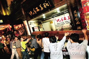 昨晚8時(shí)16分許,洪崖洞傳統(tǒng)風(fēng)貌區(qū)四樓天成巷438號(hào)至440號(hào)之間一長8.27米、寬1.1米的商鋪飛檐及附屬物發(fā)生垮塌,砸傷5人,其中傷勢較重者1人。