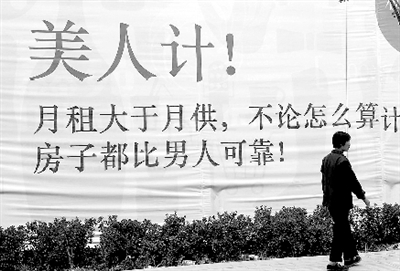 根據(jù)何先生所提供的線索,記者在河醫(yī)立交橋向西約1000米的棉紡東路上,看到了這則面朝南的巨幅房產(chǎn)廣告。白色布景的廣告墻上赫然寫著那句讓何先生不爽的廣告。該廣告美其名曰“美人計”,是為“粉領(lǐng)公寓”做的廣告,從廣告語來看,其目標消費群是女性。