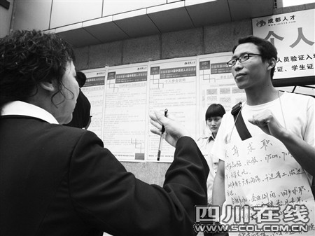 昨日上午,成都人才市場(chǎng)門外,老遠(yuǎn)就看見(jiàn)一大堆人圍在一起,被人群環(huán)繞的并不是用人單位的招聘點(diǎn),而是一名體形較瘦、身著淺藍(lán)色T恤衫的年輕小伙子,小伙子的胸前掛著一塊告示,上面用紅筆寫(xiě)著“賣身求職”的字樣和他自己的簡(jiǎn)歷。小伙子叫王志強(qiáng),今年25歲。