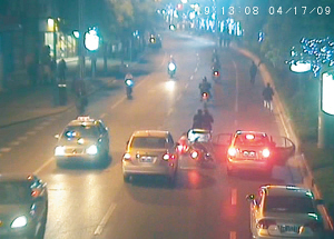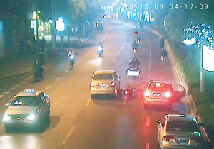 從回放的錄像中,記者清楚地看到,在非機動車道上,違章停放的尼桑車前方幾米處,曾出現(xiàn)過一輛淺色私家車。該車剛停下不久,騎車人的身影就出現(xiàn)在了畫面中,只見右后側車門先打開,有個大約六七歲的長發(fā)小女孩下了車。幾乎與此同時,左后側車門也毫無預警地打開了,正巧刮擦到了猝不及防的助動車,騎車人瞬間倒地,瞬間的突發(fā)情況以致后續(xù)緊跟著的頤達車盡管慢速行駛卻也根本無法避讓,硬生生壓過騎車人。