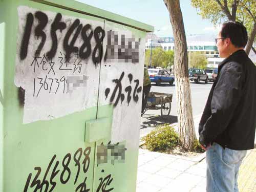 住在娘熱路附近的卓女士告訴,一些涂寫非法小廣告的人都是趁天黑或早上人比較少的時候伺機作案。他們這些人就是和管理部門‘打游擊’,很難被抓住!弊颗扛嬖V記者,拉薩是自治區(qū)的首府城市,而娘熱路是我市的一條主要干道,違法分子到處亂涂亂寫非法廣告嚴(yán)重影響了市容市貌,出售“槍支迷藥”的非法小廣告出現(xiàn)在城市中心地帶更會讓內(nèi)地游客擔(dān)心拉薩的社會治安,從而給拉薩的經(jīng)濟社會發(fā)展帶來不小危害,希望有關(guān)部門進一步加大工作力度,狠狠打擊這些違法分子。