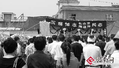 昨日上午11點,包志堅、周湛萍的追悼會在盈江縣人民醫(yī)院新家屬小區(qū)內(nèi)舉行,來自社會各界的上千人自發(fā)前來沉痛悼念,不時有單位、個人的花圈送抵現(xiàn)場。