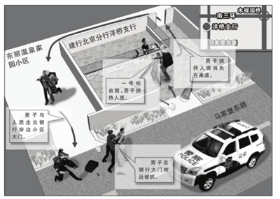一號柜臺是一名男業(yè)務(wù)員,表現(xiàn)得比較冷靜。業(yè)務(wù)員邊勸其冷靜,邊將一沓沓百元人民幣推到窗外,整個動作很緩慢。劫匪情緒激動,一直在催促動作快些。幾分鐘后,劫匪顯然失去耐性,將已經(jīng)拿出的現(xiàn)金裝到黑色背包中。據(jù)警方事后發(fā)布,被裝進背包的現(xiàn)金共14萬元。劫匪勒著喬女士的脖子向大廳內(nèi)側(cè)的通道走去。其間,喬女士在不停叫喊,這時門口的人才看到,在劫匪的左手上還有一把刀架在喬女士脖子上,右手黑色手槍卻沒有指著人質(zhì),帶著人質(zhì)消失在甬道內(nèi)。