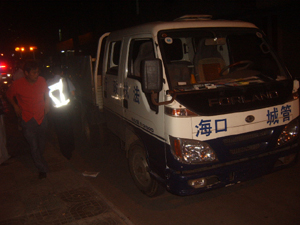 會不會是秀英區(qū)城管大隊的另一輛舊的行政執(zhí)法車撞人逃逸呢?在場的市民都提出了疑問。記者了解到,直到昨日上午9時,交警才找到該車!拔覜]有接到通知,昨天把車開回宿舍區(qū)了。該車的鑰匙不止我一個人有,我們單位有幾個人都有該車的鑰匙。”在問起為何不將該車開來指認時,該車司機陶某如是解釋。目擊者黃先生在接到交警的通知后,特意從海甸島趕來對該車進行指認。記者看到,該車屬于1.25小型卡車,車身非常舊,車廂兩側(cè)上層由鋼管圍成,除了該車前后都有掛車牌外,其余特征與黃先生所描述的肇事逃逸車輛非常像。